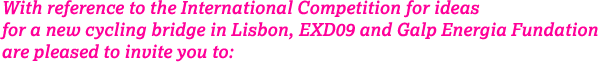 Announcement of the winner of the International Competition for Ideas for a new Cycling Bridge in Lisbon + Opening of the exhibition with the selected works and the Jury’s shortlist + A party will follow with an invited DJ.